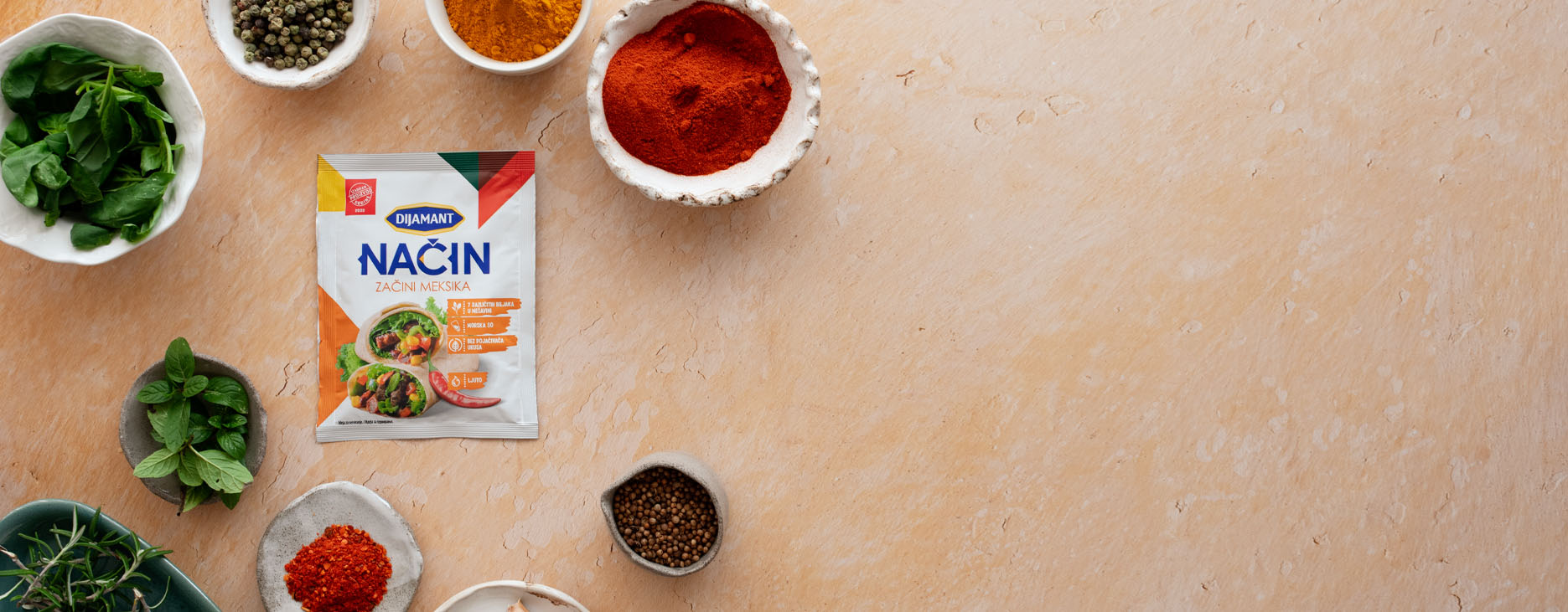Dijamant Način začini Meksika kombinacija su sedam različitih biljaka, nosioci su oznake „Izabrani proizvod godine“, sadrže samo morsku so i u potpunosti su bez pojačivača ukusa.