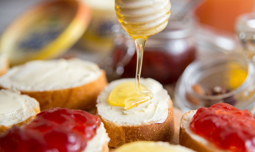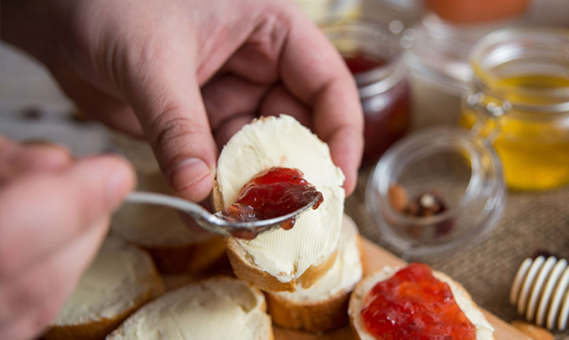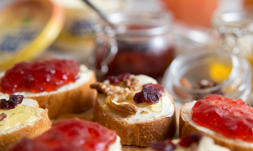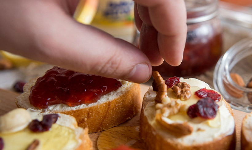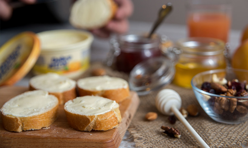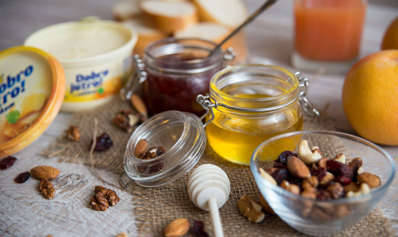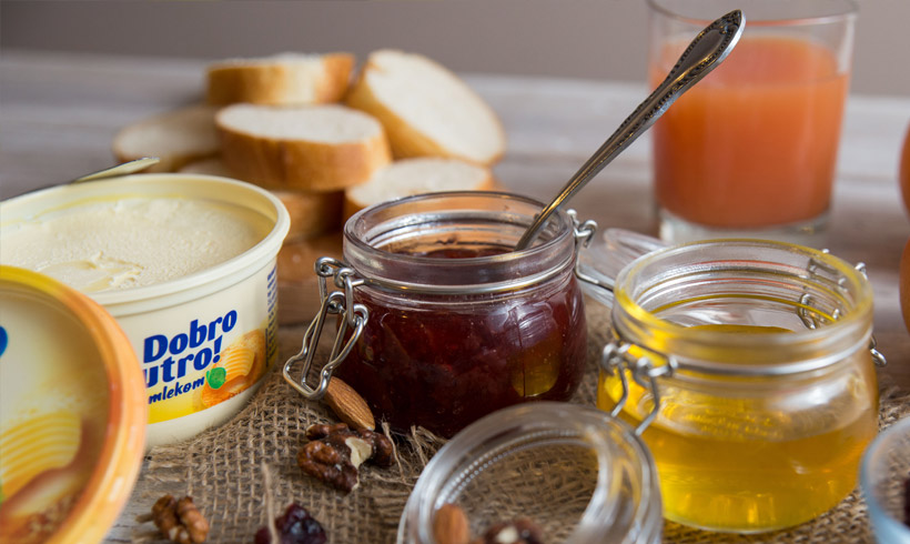 Naravno, tu su i domaći bagremov med, brusnice, suve kajsije, orasi, bademi i suve šljive. U velikom bokalu je sveže ceđena naranča sa malo limuna i meda. Sva raskoš ovih sastojaka ne bi nam ništa vredela da nema našeg omiljenog Dobro jutro margarina koji ukuse spaja u kremast i bogat zalogaj.